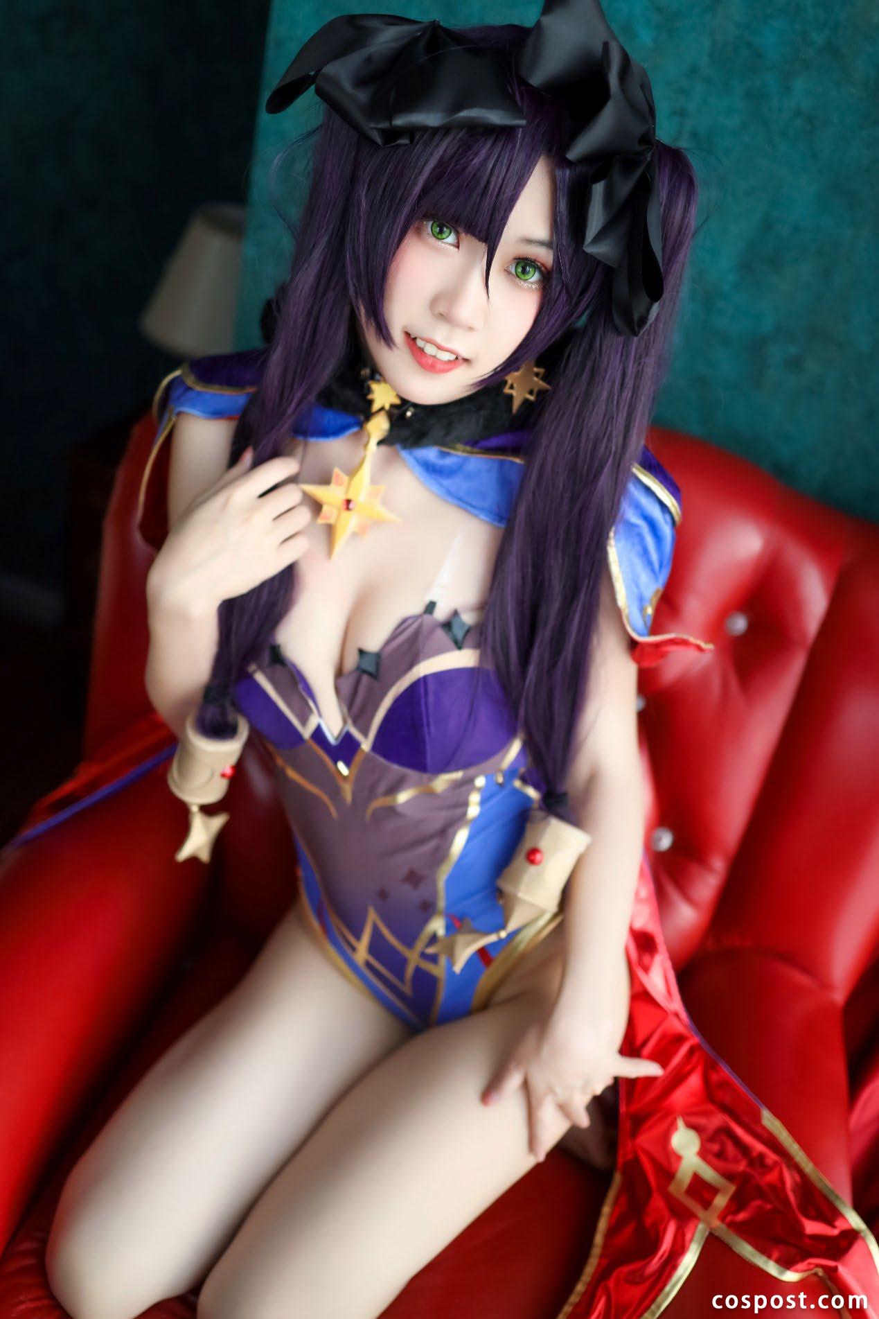 2025 年推出的青瓷拟人原创系列成为代表作,发髻上的冰裂纹瓷簪融合非遗工艺,素色裙摆铺展如青花瓷釉,完美诠释 “素胚勾勒青花” 的东方美学。其作品兼具细腻与大气:《CLAMP》樱公主的十二单衣耗时四小时穿戴,《原神》甘雨则以优雅身姿还原角色神性。曾获 “国漫 cos 大赛最佳国风奖”,擅长通过极简修图保留皮肤质感,用光影叙事替代夸张造型。